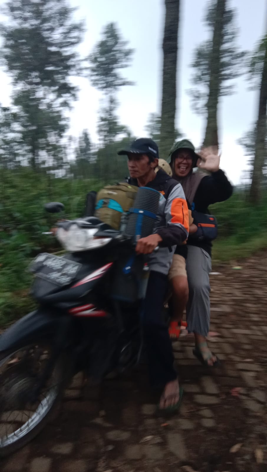 beberapa anggota tim naik ojek dari gerbang panderman ke pos 1 untuk memudahkan perjalanan, beberapa carier juga dibawa ojek untuk memudahkan perjalanan Hiking.
