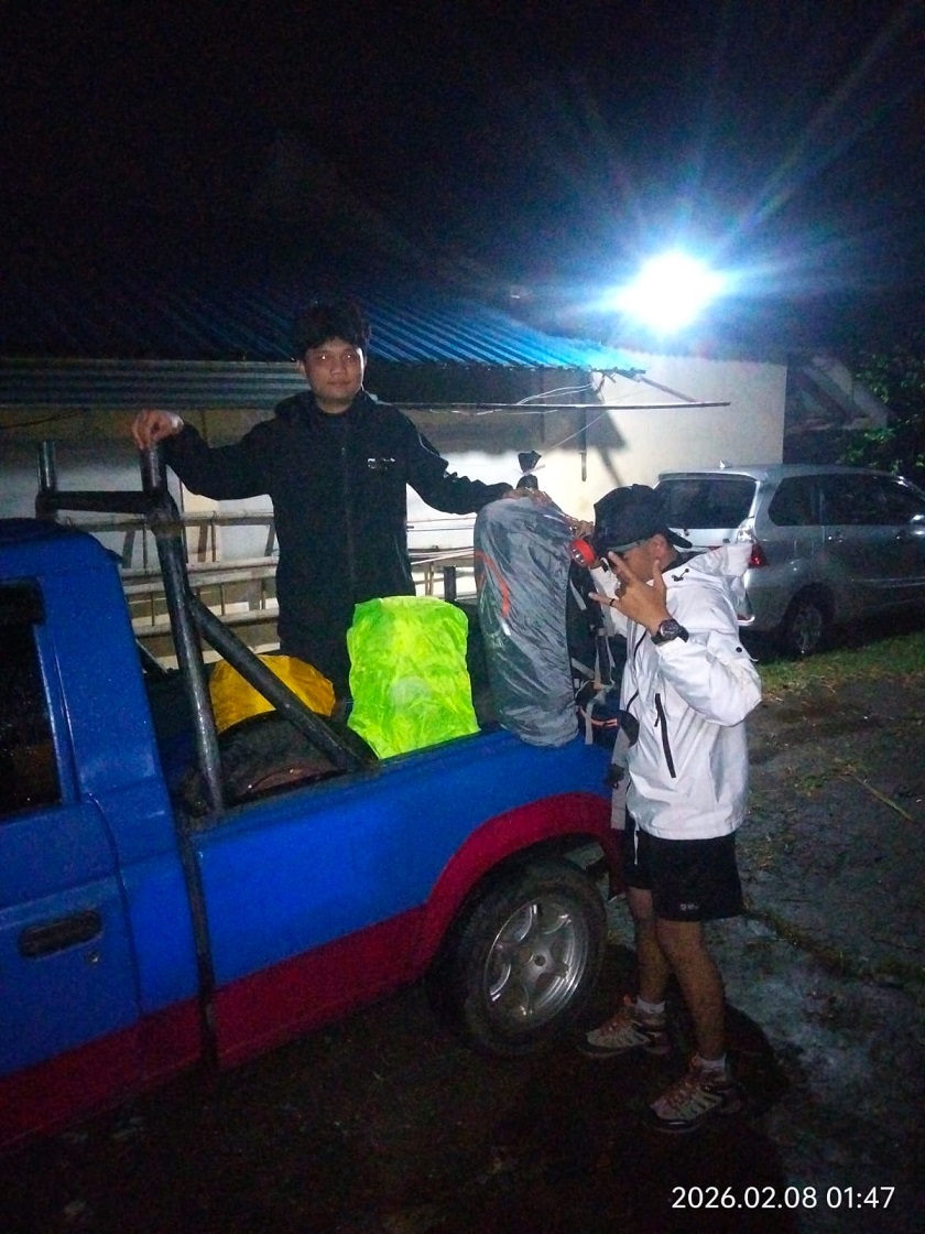 Setelah sebelumnya packing kemudian kami berangkat pukul 02.10 Dini hari, karena menunggu hujan reda serta mengisi perut sebelum melaju kendaraan menuju gerbang panderman, di jalan kami lihat ada beberapa pendaki dari tempat parkir ke gerbang panderman, mereka dari UM dengan pimpinan KADEK, kami memeberikan tumpangan untuk memudahkan mereka sampai ke gerbang panderman.